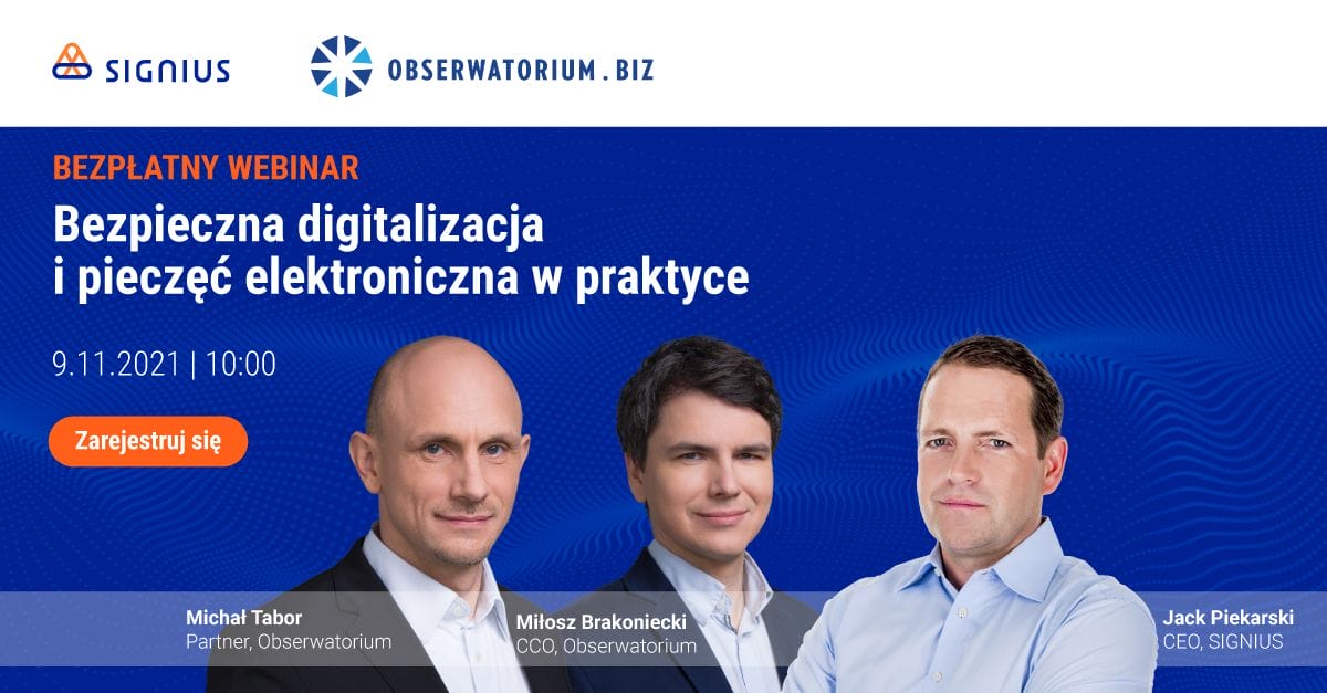 Wspólnie z naszym partnerem – Obserwatorium.biz – niezależną firmą doradczą specjalizującą się w tworzeniu i wdrażaniu strategii cyfrowych w przedsiębiorstwach – 9.11.2021 o godzinie 10:00 poprowadzimy Webinar mający na celu zapoznanie z bezpiecznym rozwiązaniem elektronicznym, jakim jest kwalifikowana pieczęć elektroniczna, która skutecznie adresuje powyższe problemy w dużych i średnich organizacjach.