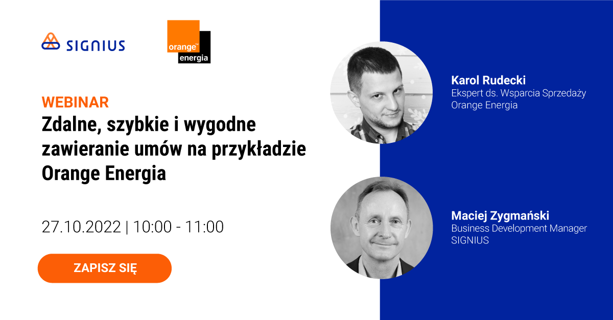 Wspólnie z naszym klientem Orange Energia już 27.10. | 10:00 zapraszamy na bezpłatny WEBINAR podczas którego przedstawimy najszybszy i najwygodniejszy sposób na zawieranie umów online.